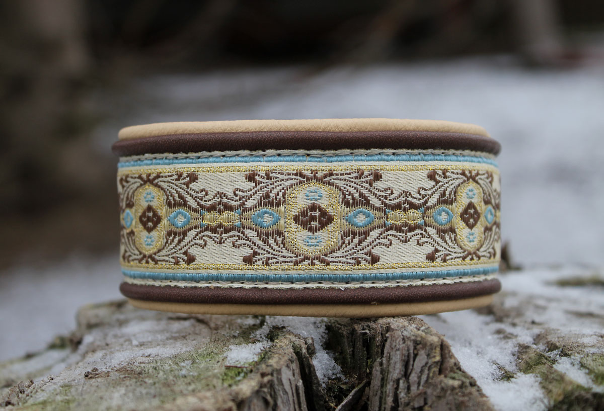 decorated with a Jacquardtrim with cream, gold, lightblue and brown