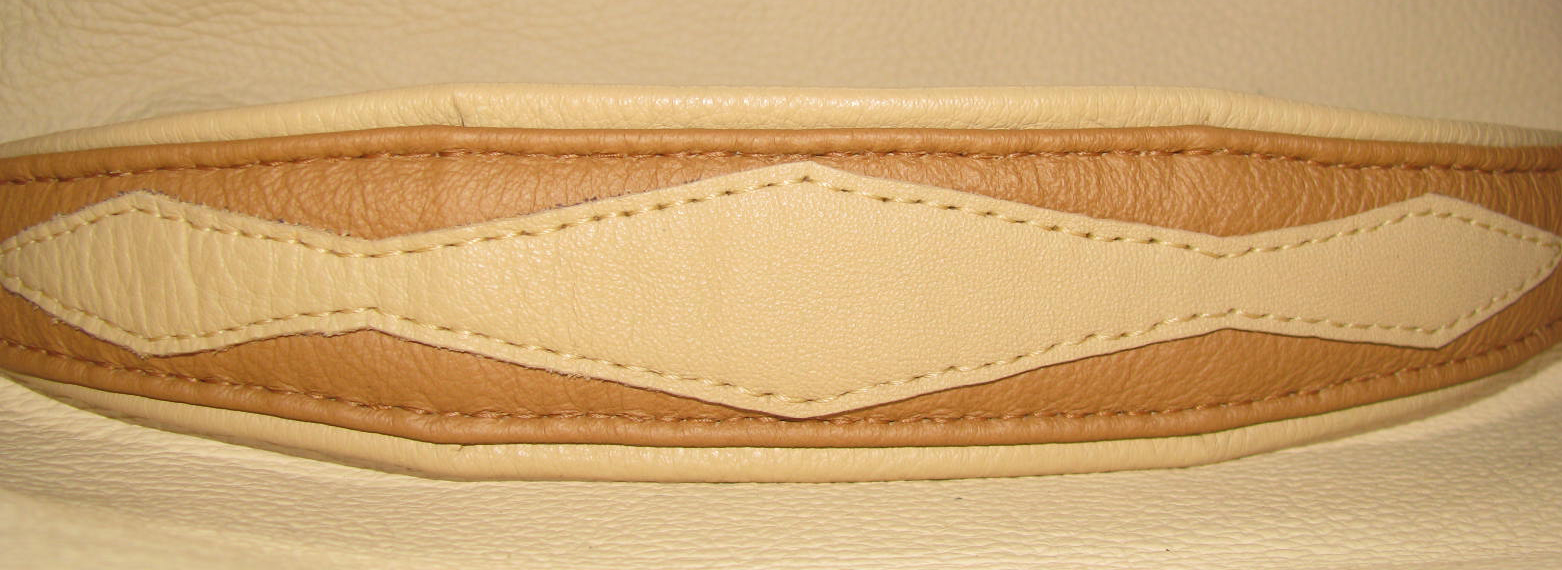 Figure 5 shows vanilla beige on the exterior, black brown on the interior. A big black brown leather patch and a vanille beige leather in the middle