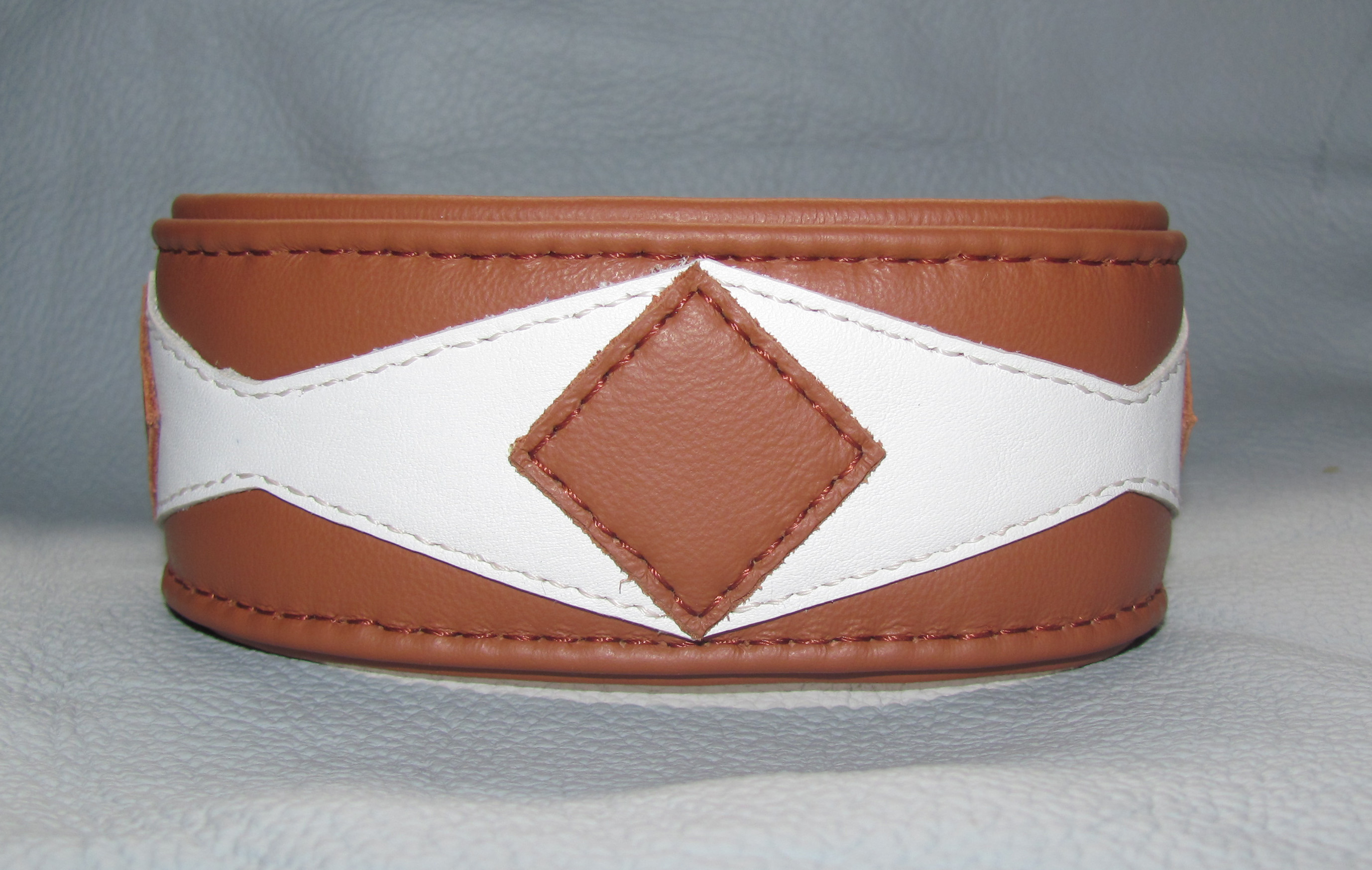 Figure 1 shows saddlebrown leather exterior and interior with one white and three saddlebrown leather patches