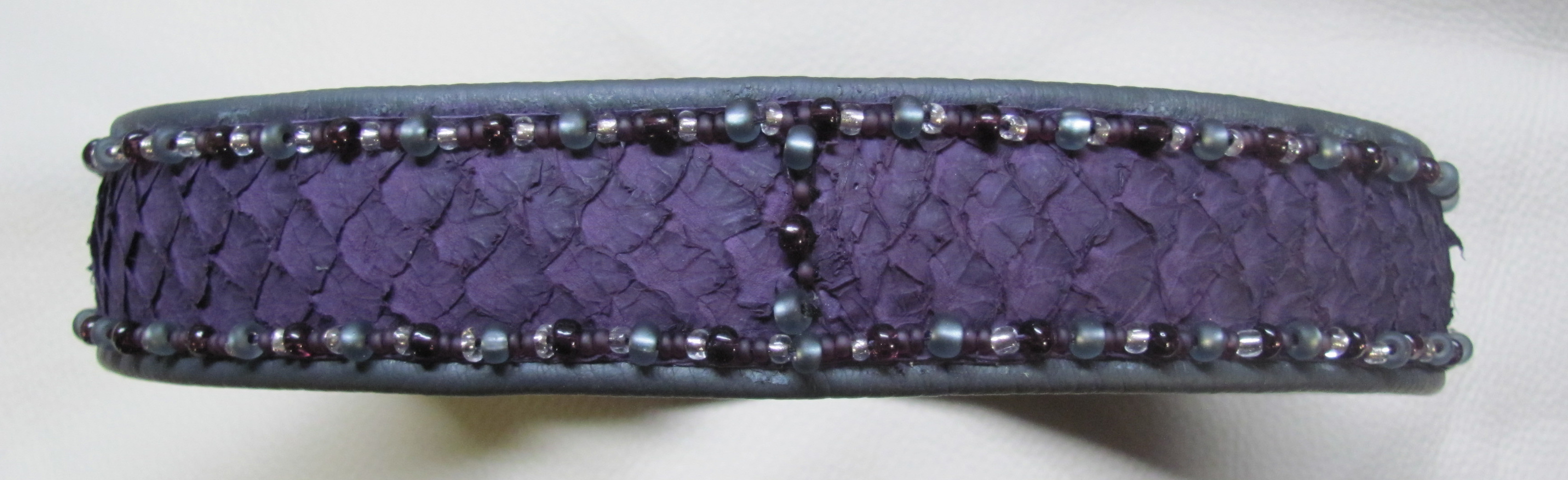 Picture 4 shows mouse grey nappa leather with plum carp leather and pearl embellishment, 3.5cm wide