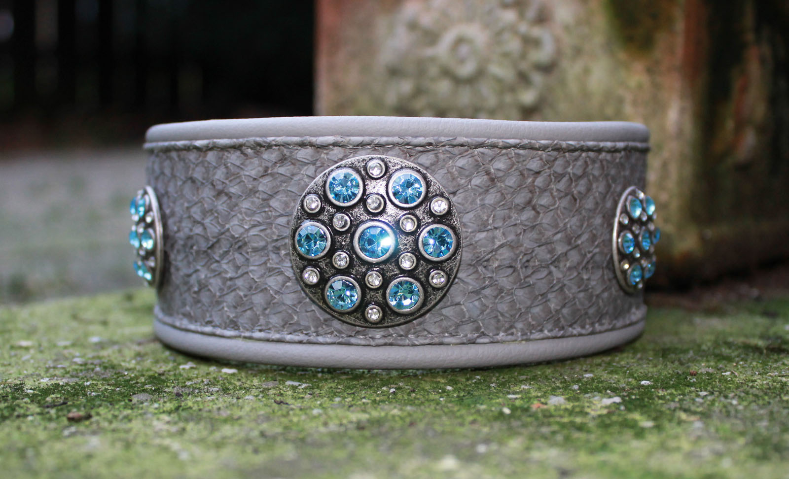 decorated with matte grey Nanai salmon leather and three appliques (925 antique silver plated) with light blue swarovski crystals and clear crystals