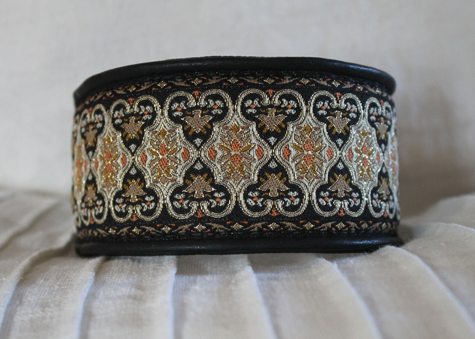 aufgenäht ist eine edle, hochwertige Jacquardborte mit filigranem Muster in schwarz, gold, creme, hellbraun, braun und apricot. Die Borte ist 5cm breit und ist nur noch in begrenztem Rahmen verfügbar.