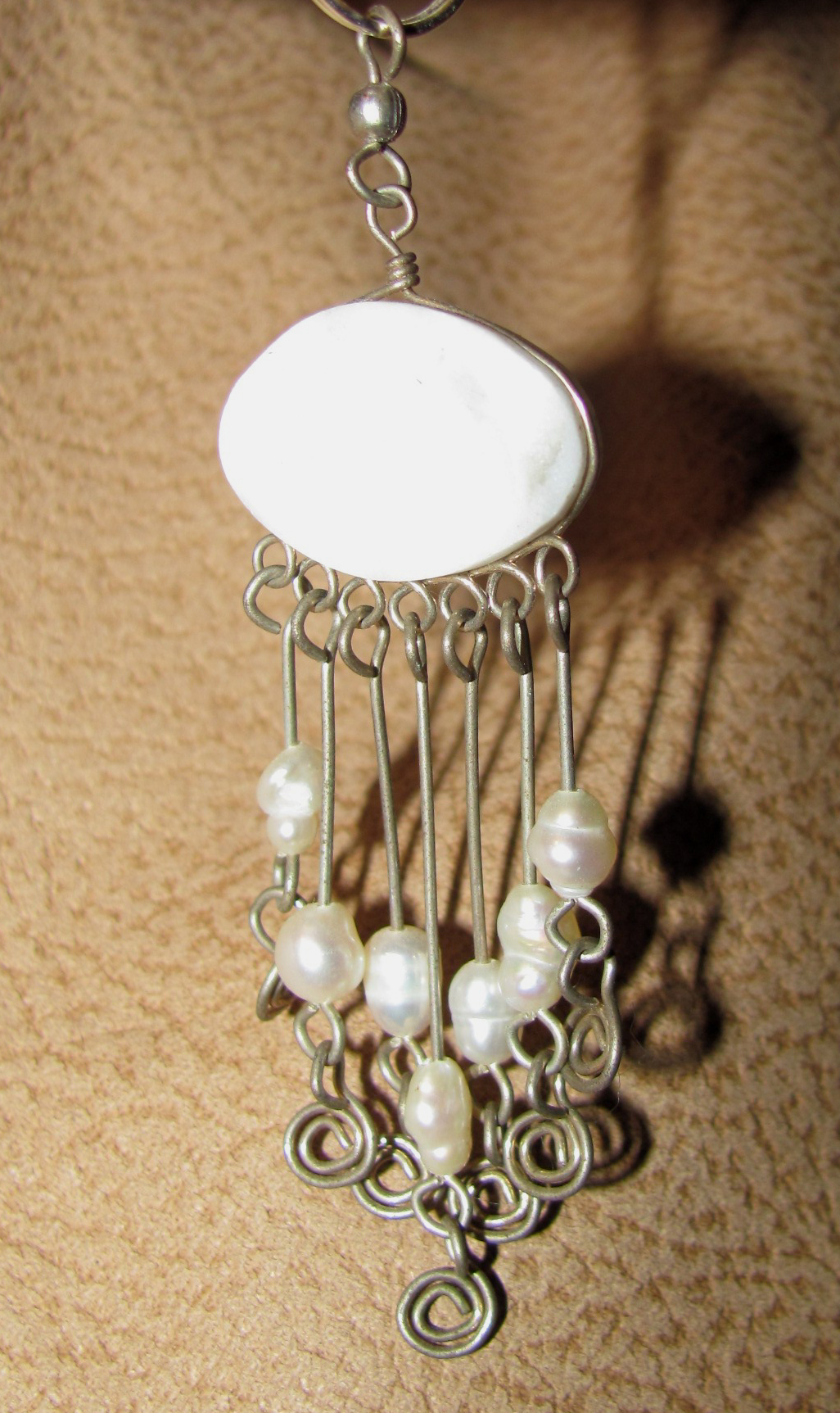 This peruvian pendant is made of alpacca-silver, a white stone and cream beads.