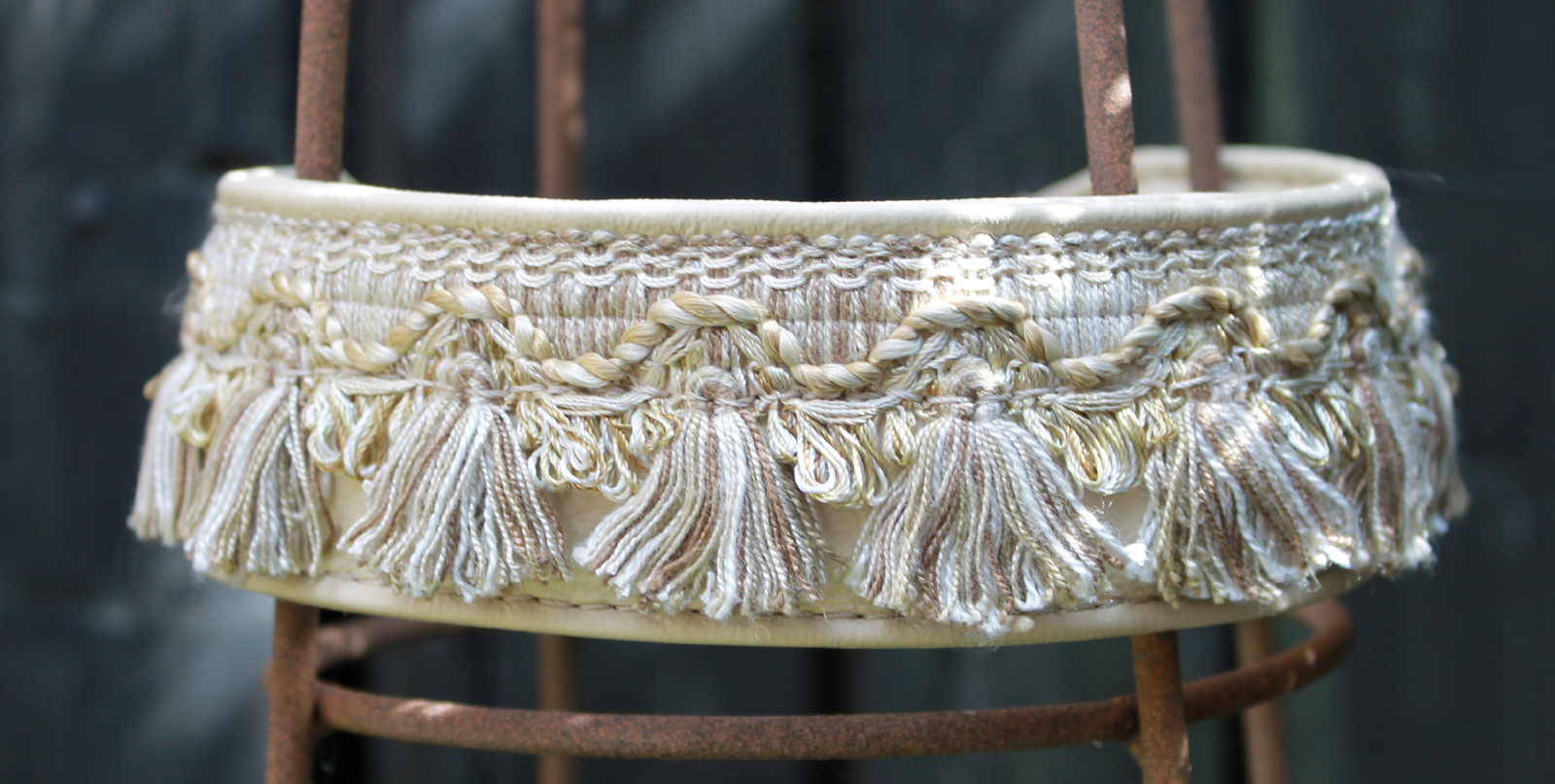 - Decorated with a 3.8cm wide Tassel-Trim in various shades of beige and cream.