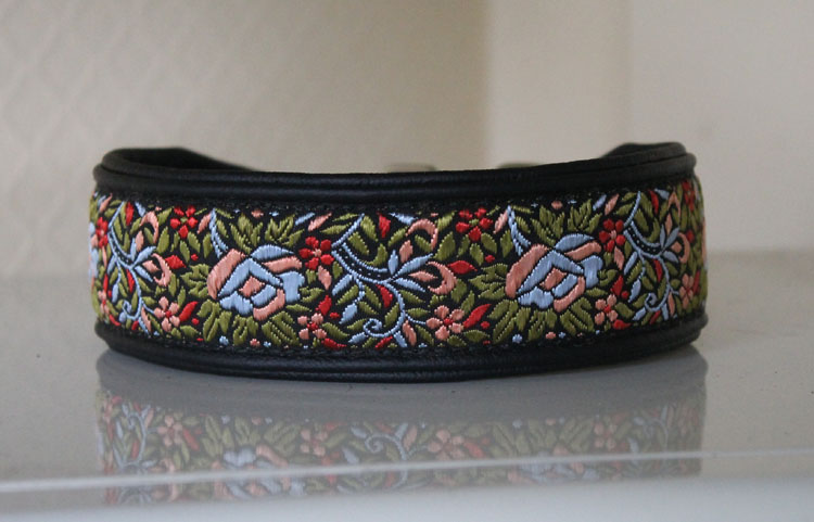 Decorated with a 3.2 cm wide Jacquardtrim with floral pattern in olive, salmon, red and lightblue on black