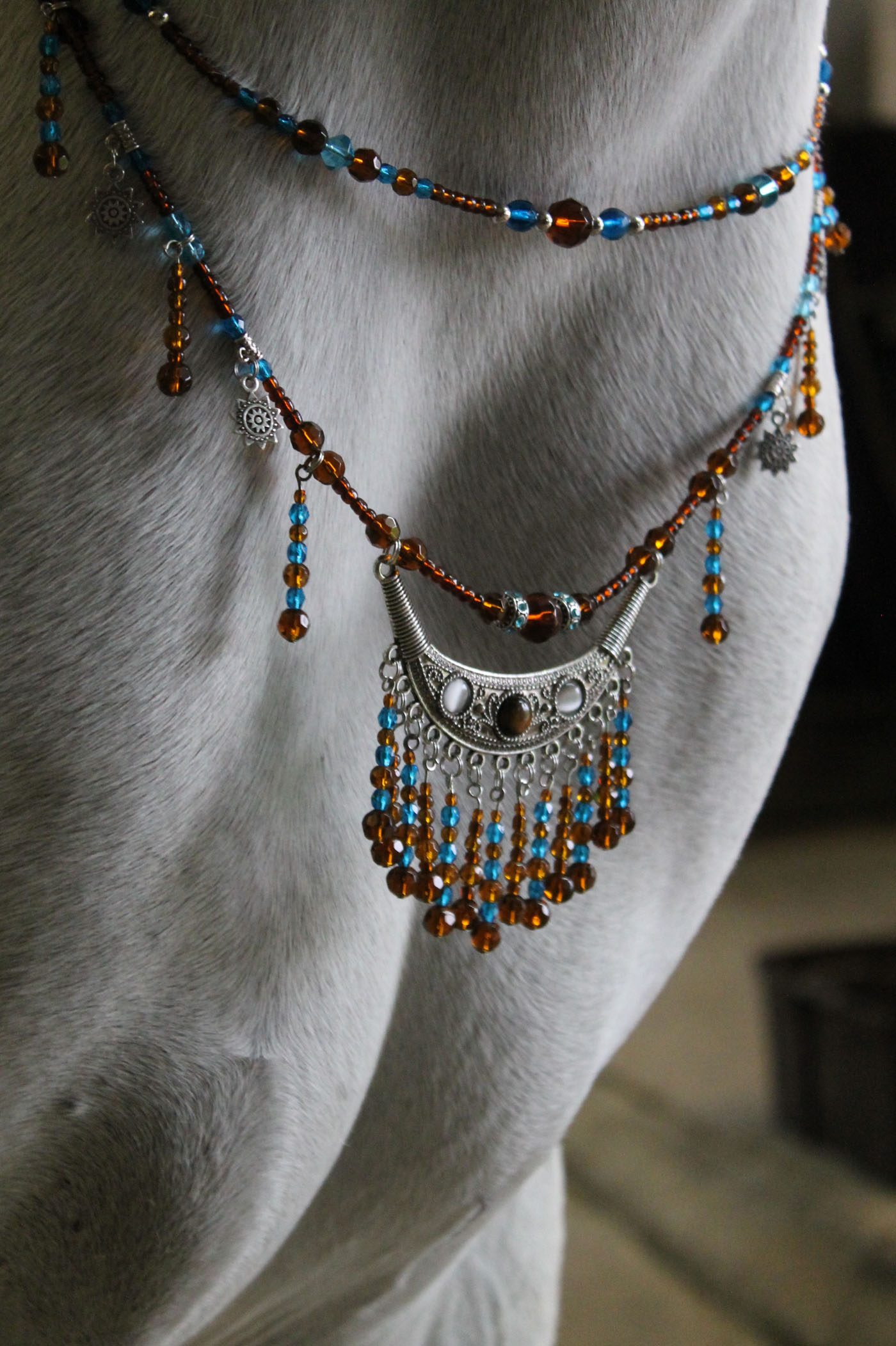 the bottom part isa double rowandends in twosilver rings, the upper, shorterpartends with two small carbines - if desired, several upper parts with different lengths can be made so that you can use the breast collar on every horse.